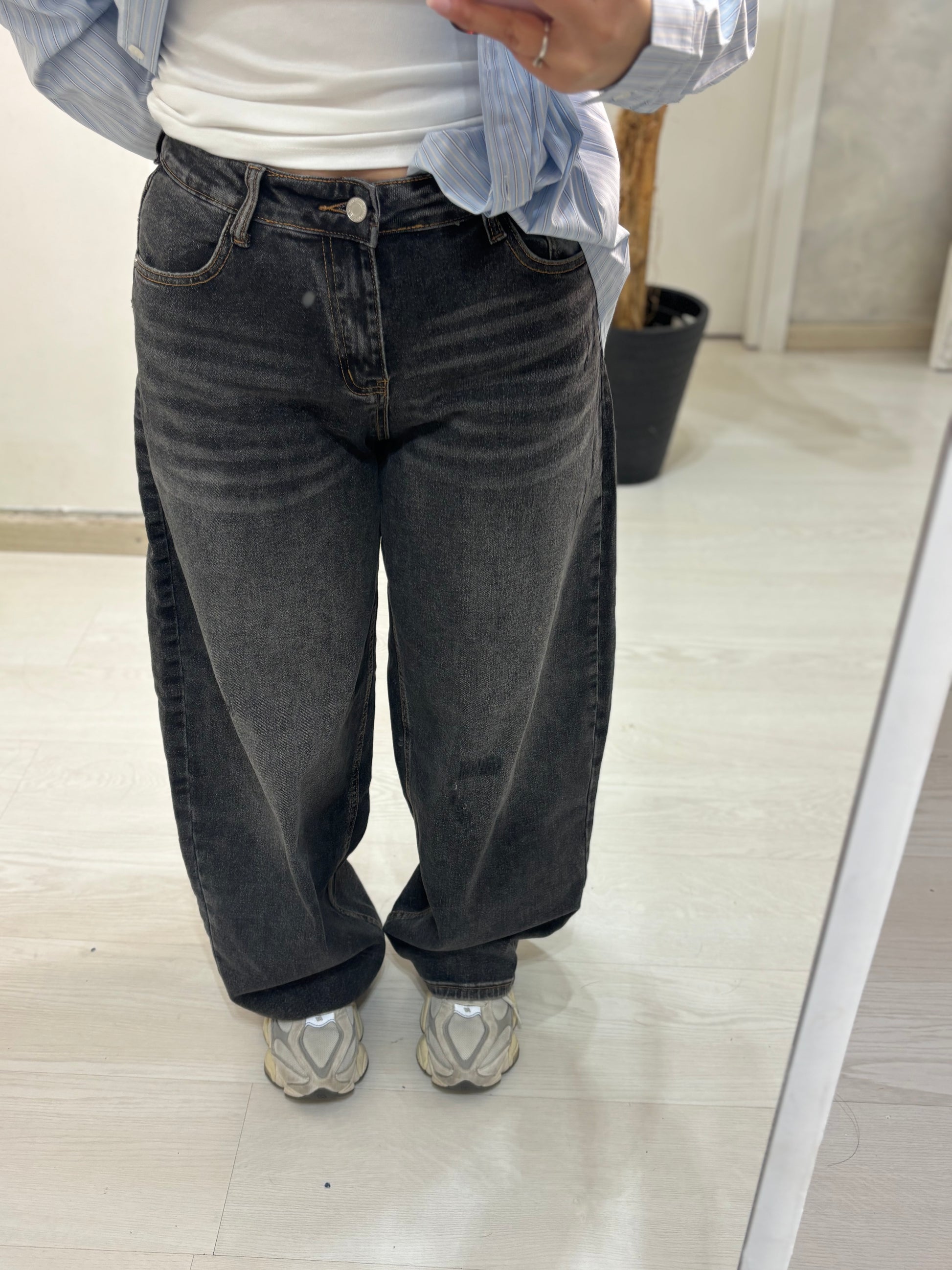 Denim ballon fit grigio con cuciture arancio. Tela elastica .